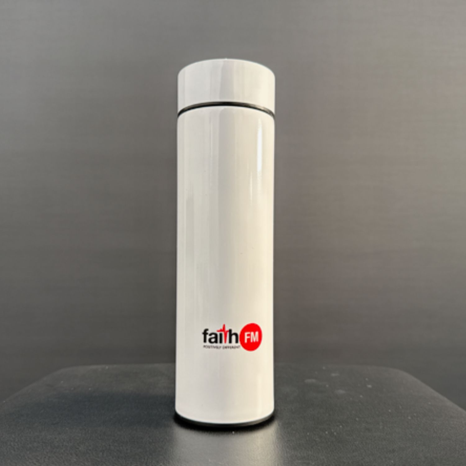 Our metal Faith FM waterbottle with a slick white coating. Enjoy hot and cold drinks from this bottle with a temperature monitoring lid, double wall design, and bright Faith FM labelling. Holds 450ml comfortably and comes with a small tea strainer.